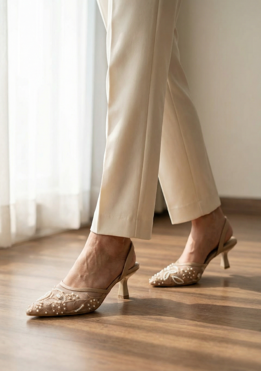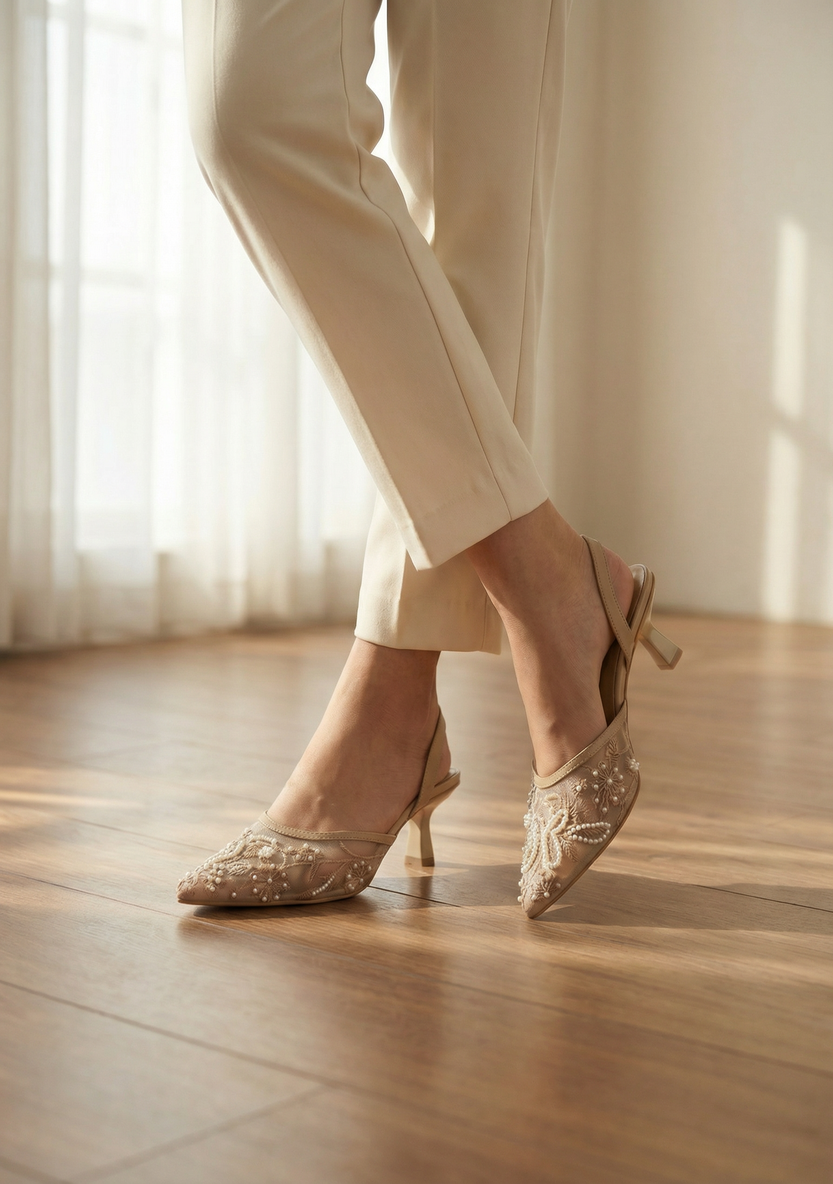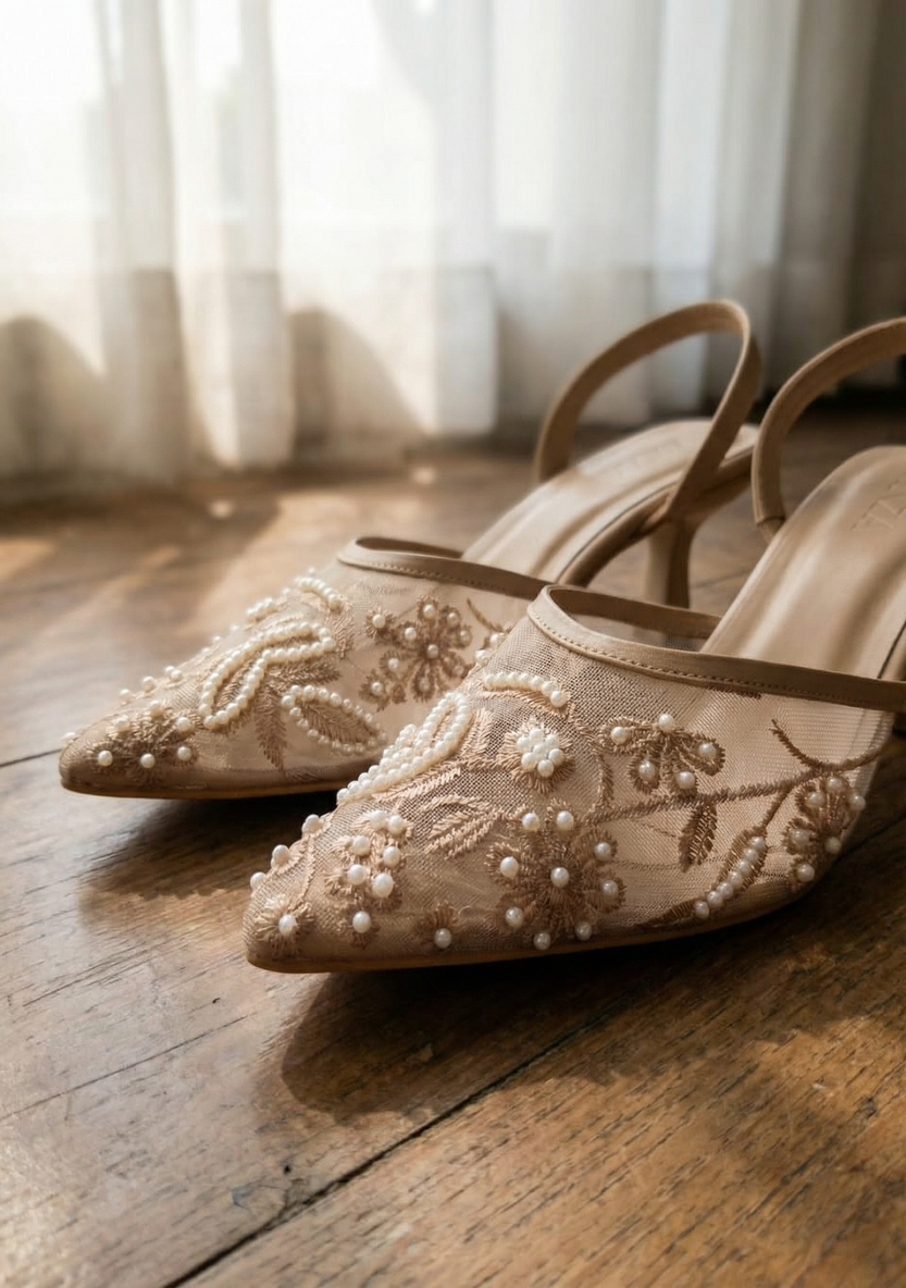 A soft nude mesh base elevated with tonal embroidery and luminous pearl accents. In Nude, Audrey embodies effortless elegance — refined, graceful, and endlessly versatile. The delicate beadwork floats over sheer mesh, while the sculpted kitten heel keeps the silhouette feminine, polished, and timeless.