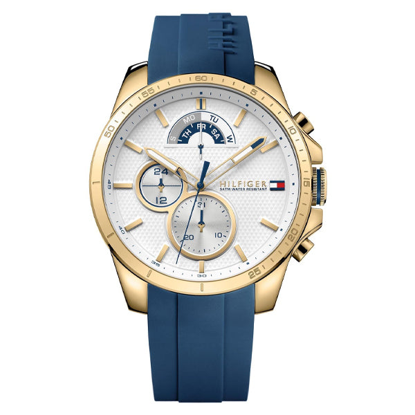 Tommy Hilfiger Decker Blue Rubber Strap White Dial Chronograph Quartz Men Watch 1791353 - 100% Authentic with Official Warranty & Free Shipping Across Pakistan.