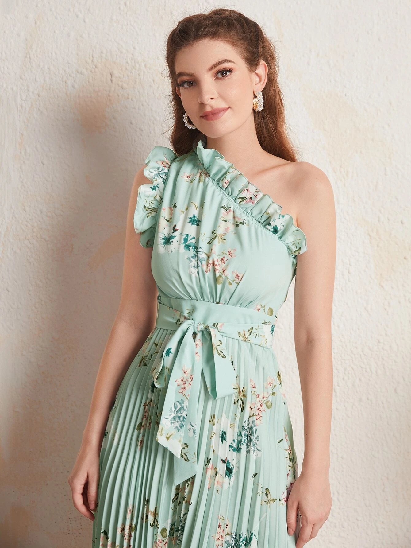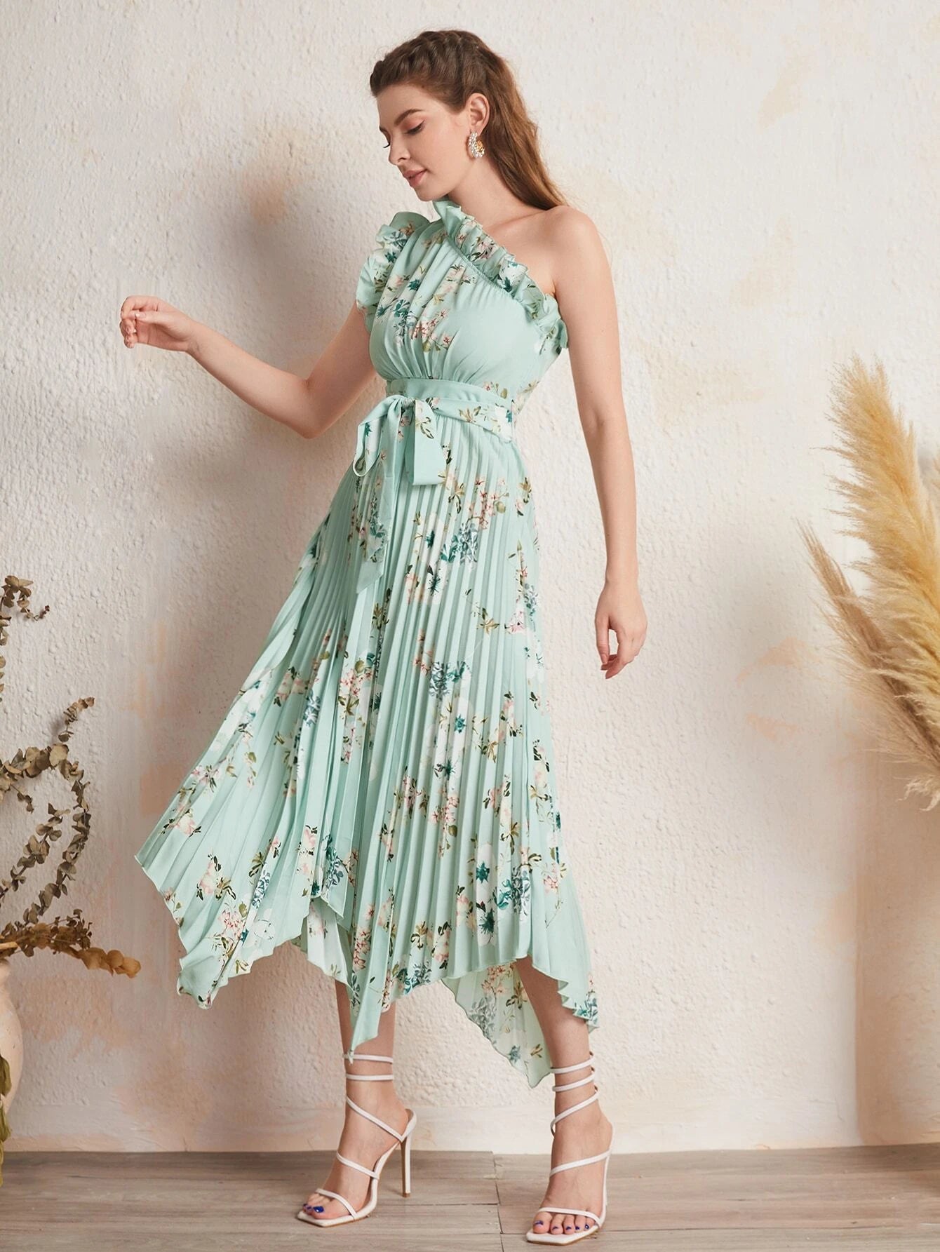 SHEIN Ruffle Trim One Shoulder Pleated Hanky Hem Belted Floral Dress