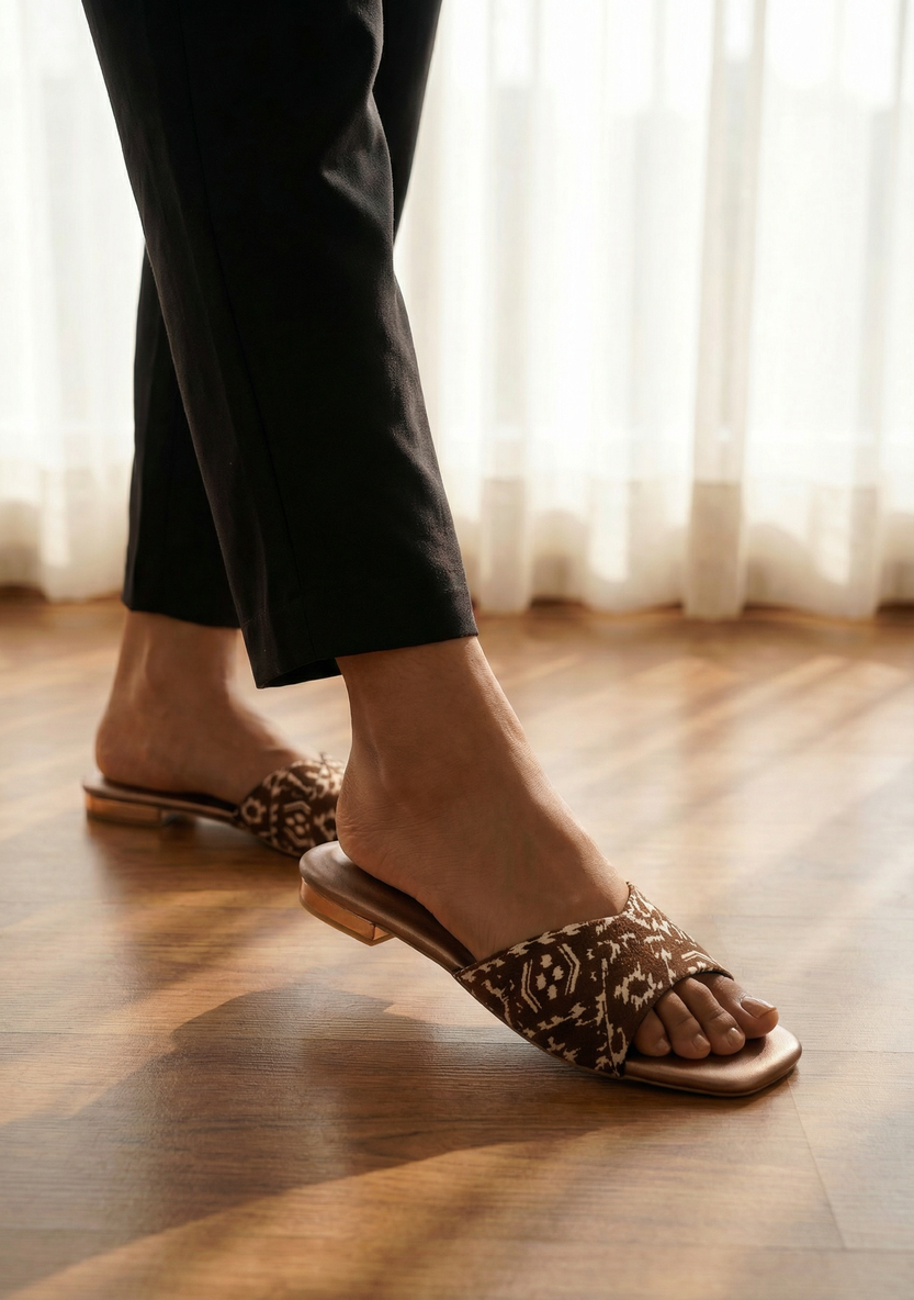 Mona Lisa is where tradition meets artistry. As part of our Artisan Line, this design celebrates handcrafted beauty with intricate printed fabric and a sleek, contemporary silhouette. The single wide strap, adorned with timeless patterns, pays homage to age-old craftsmanship, while the cushioned sole ensures all-day comfort. Effortlessly stylish, Mona Lisa is a wearable canvas—each step an artistic statement.