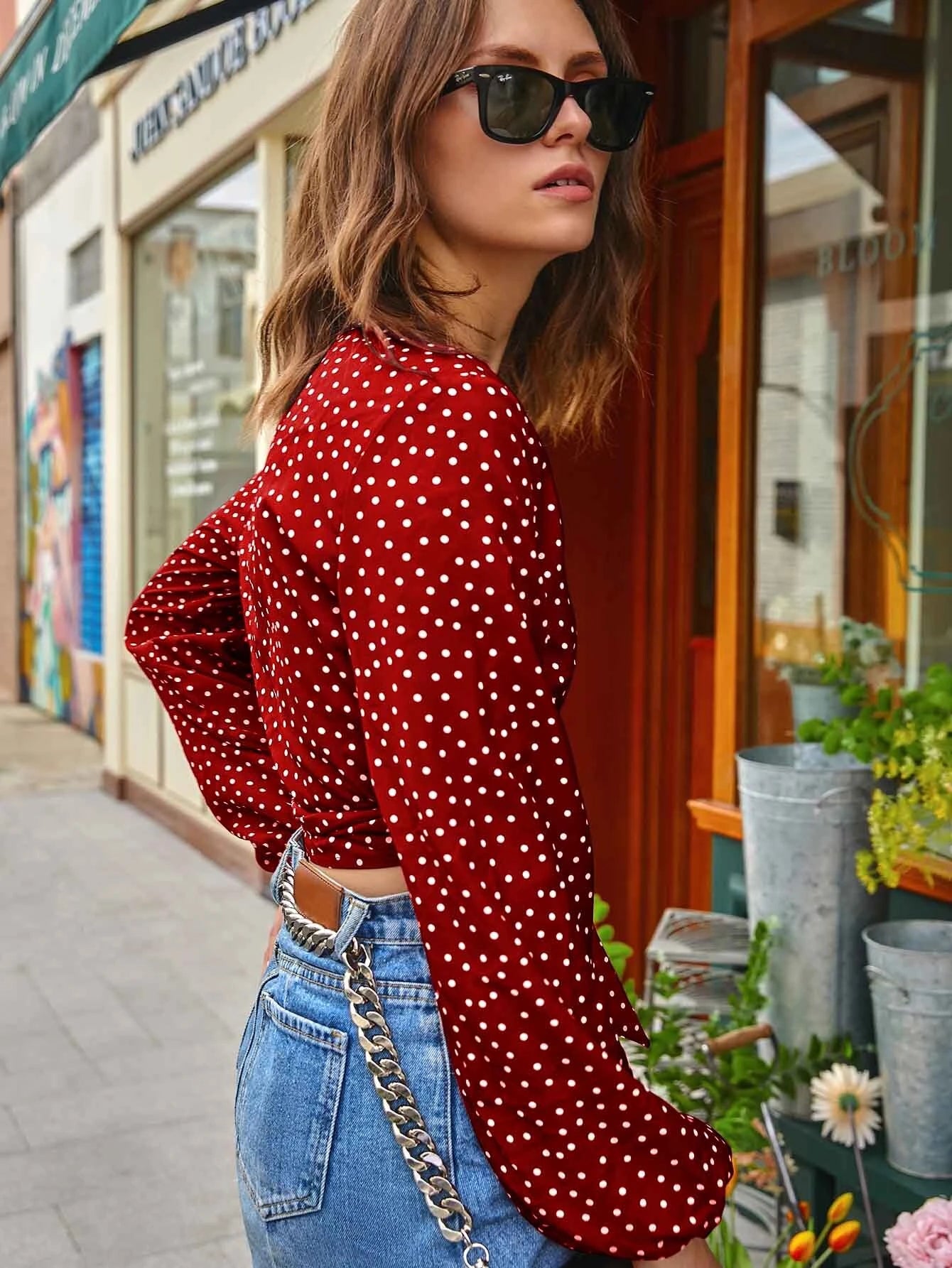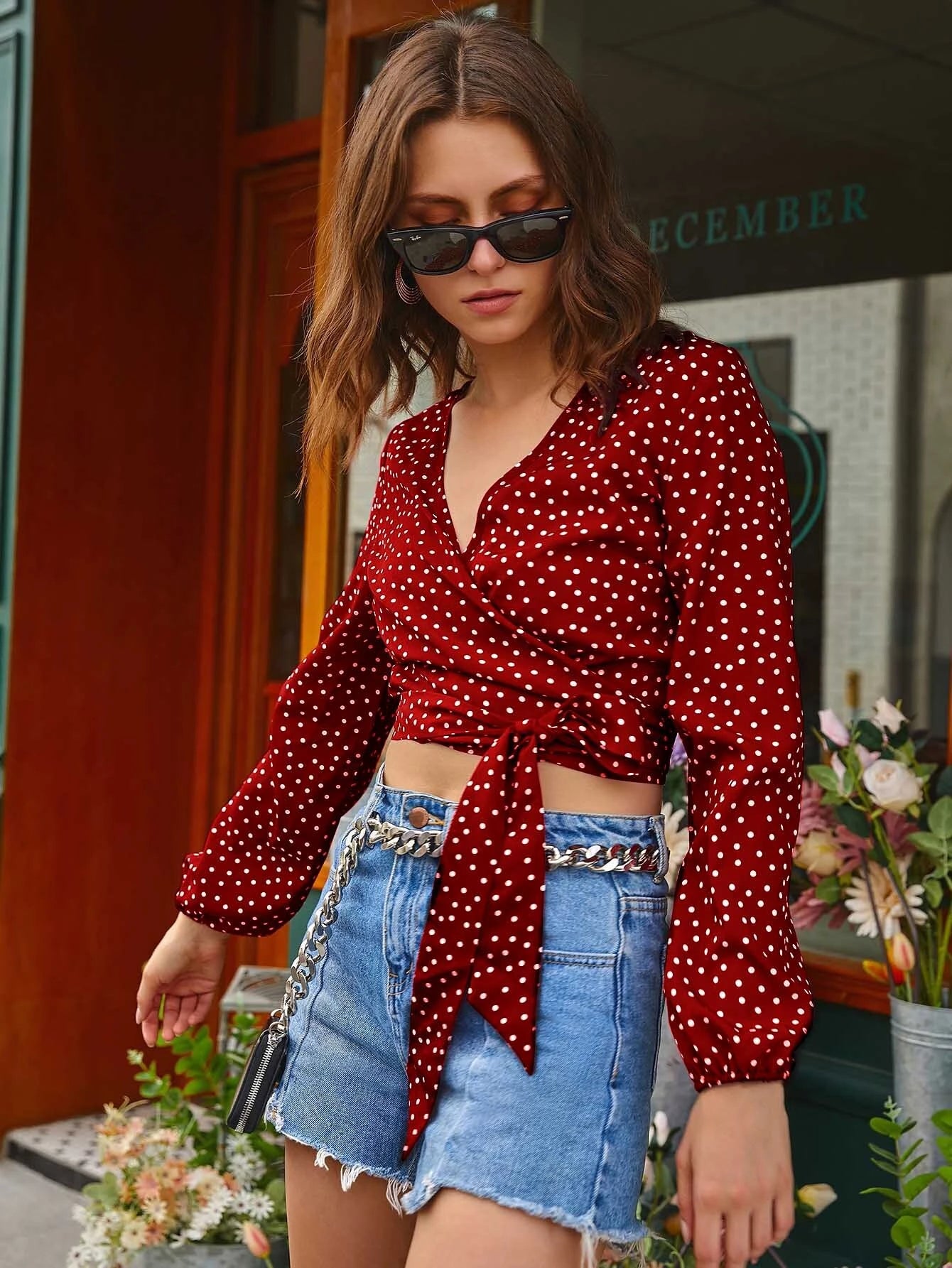 A woven wrap top featuring a polka dot print, surplice neckline, long peasant sleeves, side self-tie closure, and a cropped hem. Style this crop top with frayed denim shorts and cowboy boots.