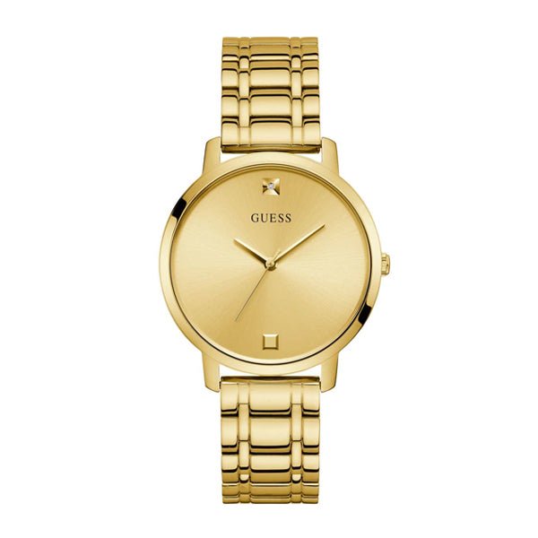 Guess Ladiess Watch has Gold case with the Dial being Gold as well as being Steel Bracelet. It is a genuine diamond marker at the 12 o'clock hour make this watch the perfect gift or self purchase!. It is shipped with its original box and official warranty card.