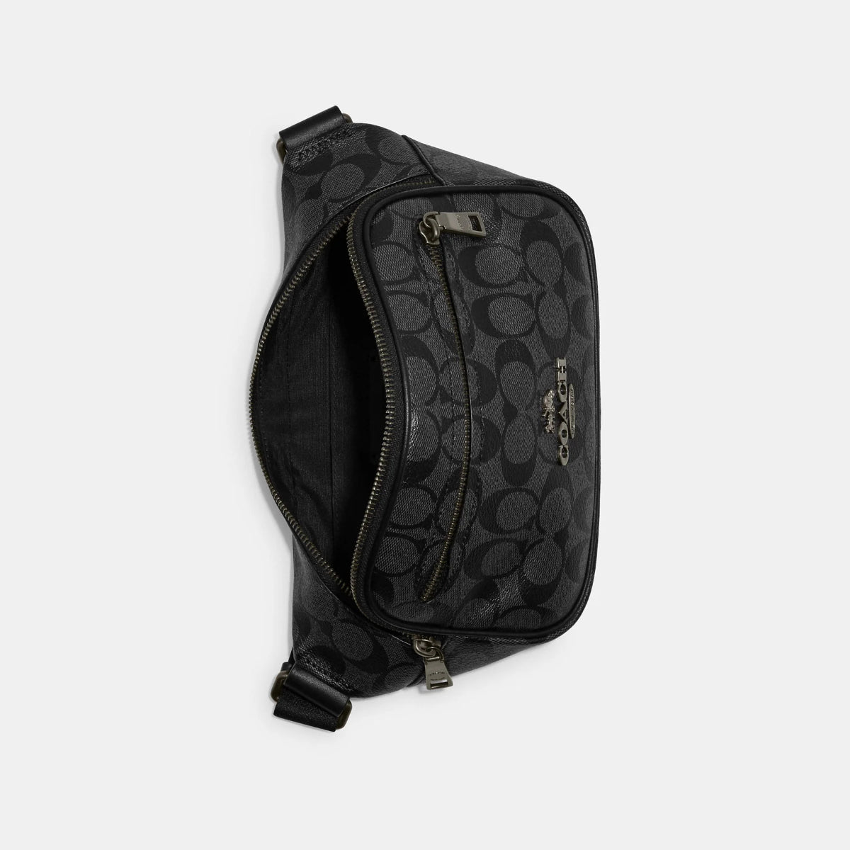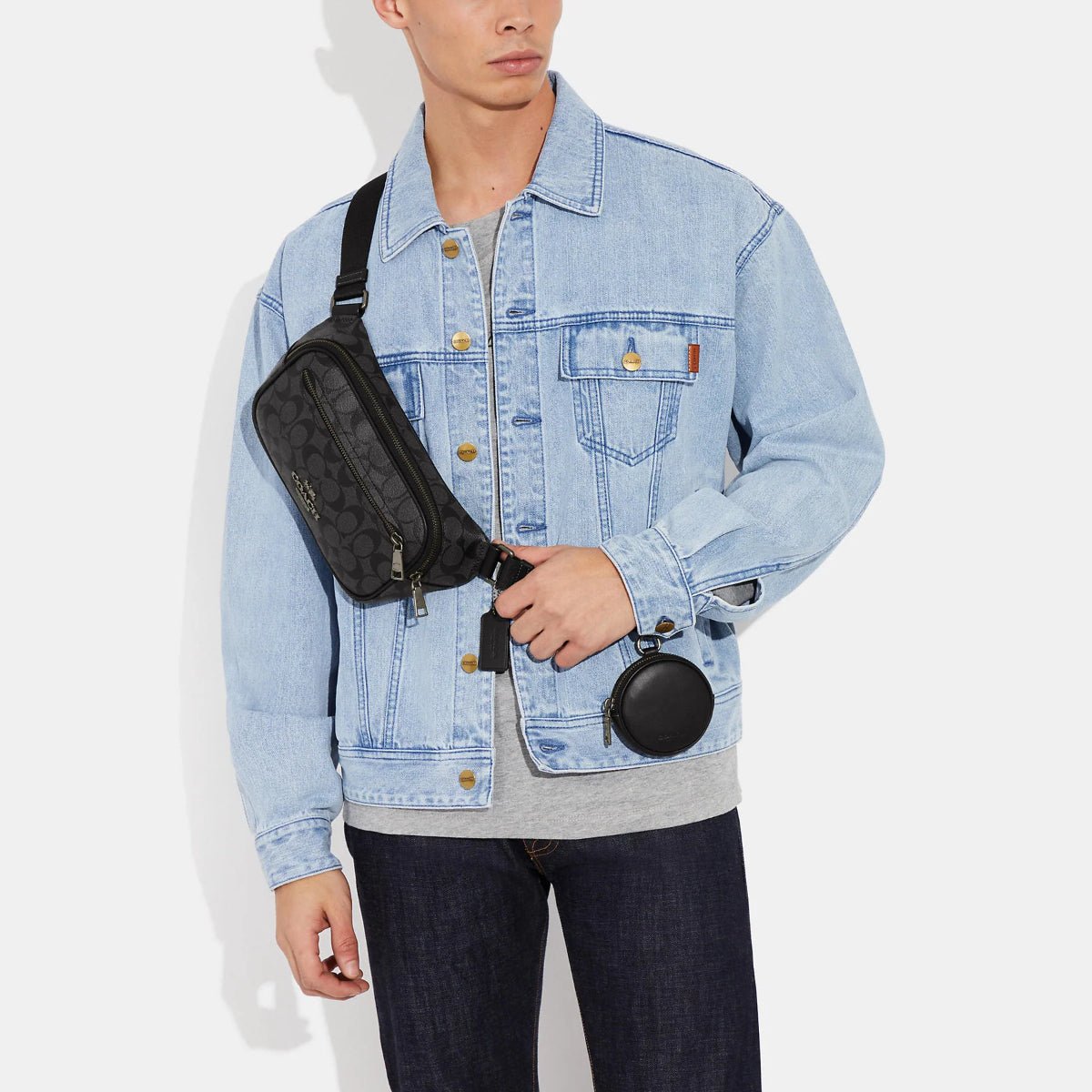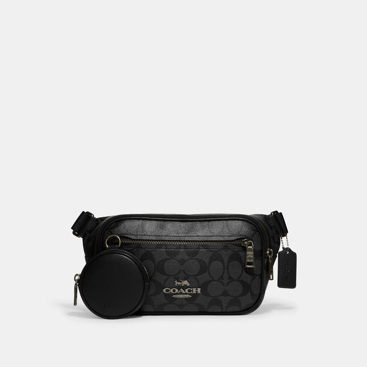 The Grey Elias Belt Bag has a stylish and robust appearance thanks to its combination of smooth calf leather and trademark coated canvas. It's a useful yet fashionable item for transporting necessities while on the road, featuring several pockets, an adjustable waist strap, and a detachable coin box.