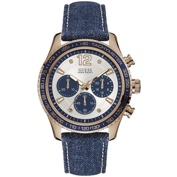 Guess Fleet Blue Denim Strap Silver Dial Chronograph Quartz Watch for Gents - W0970G3