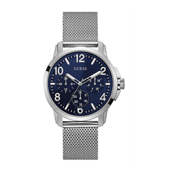 Guess Voyage Silver Mesh Bracelet Blue Dial Quartz Watch for Gents - W1040G1