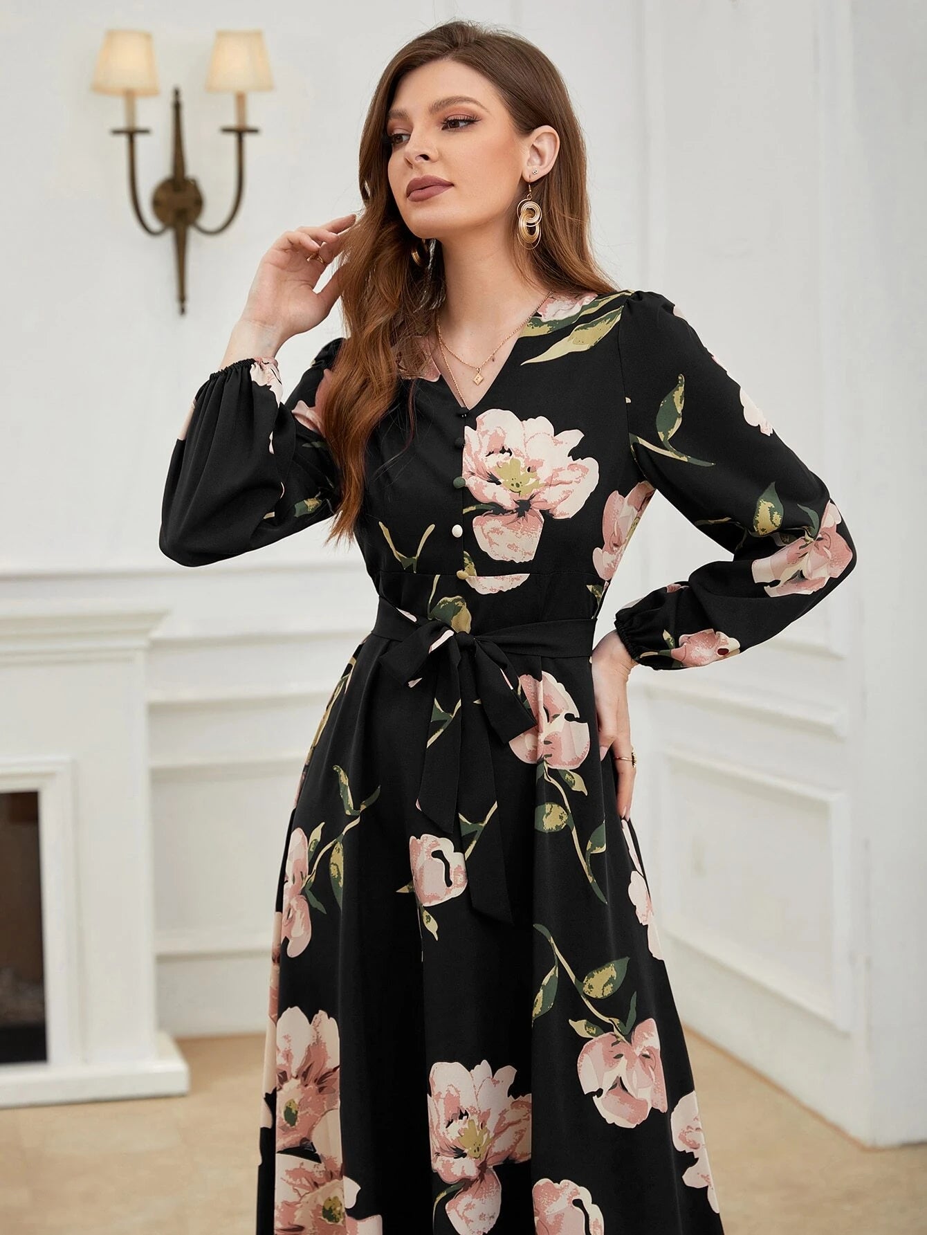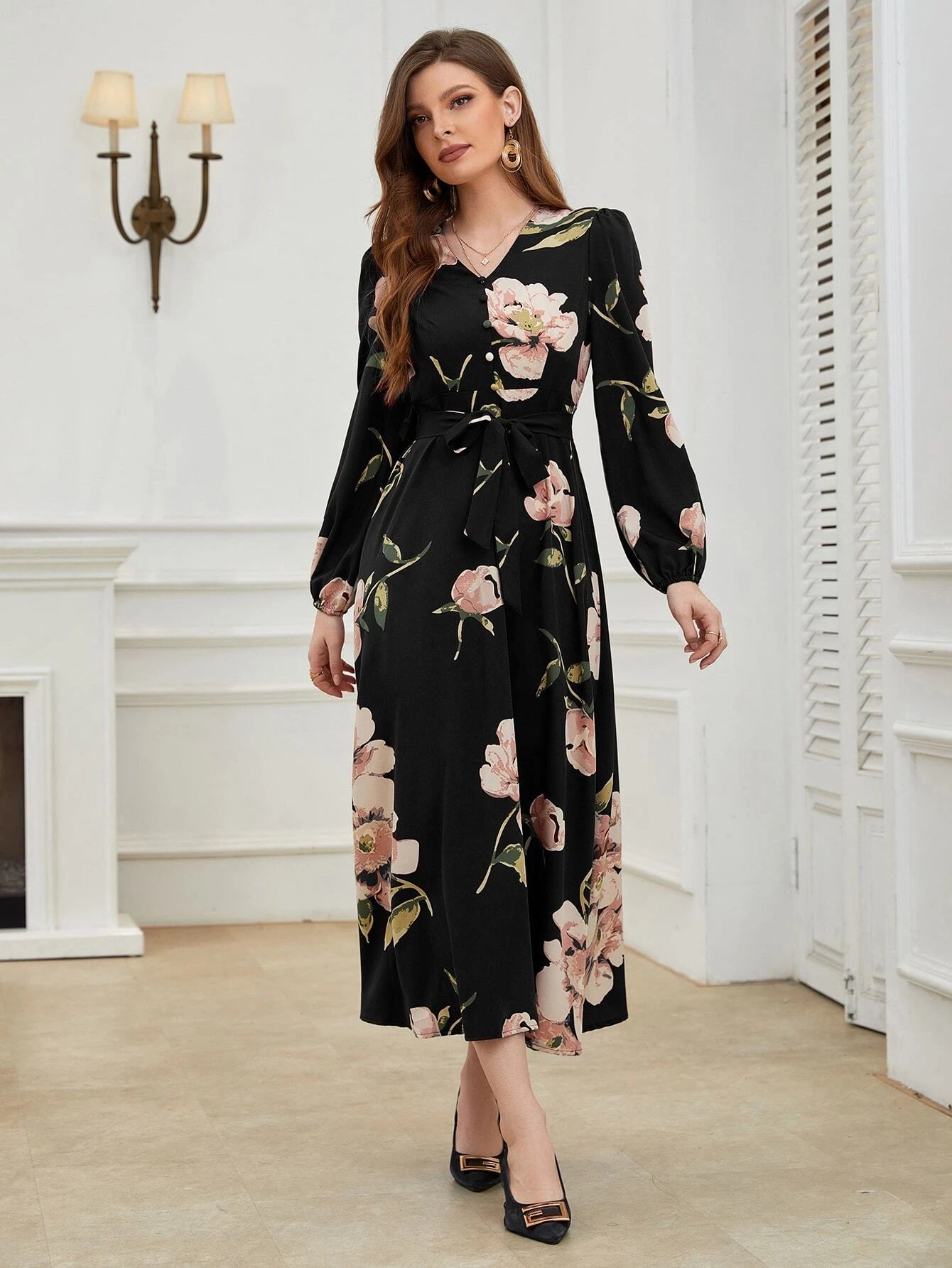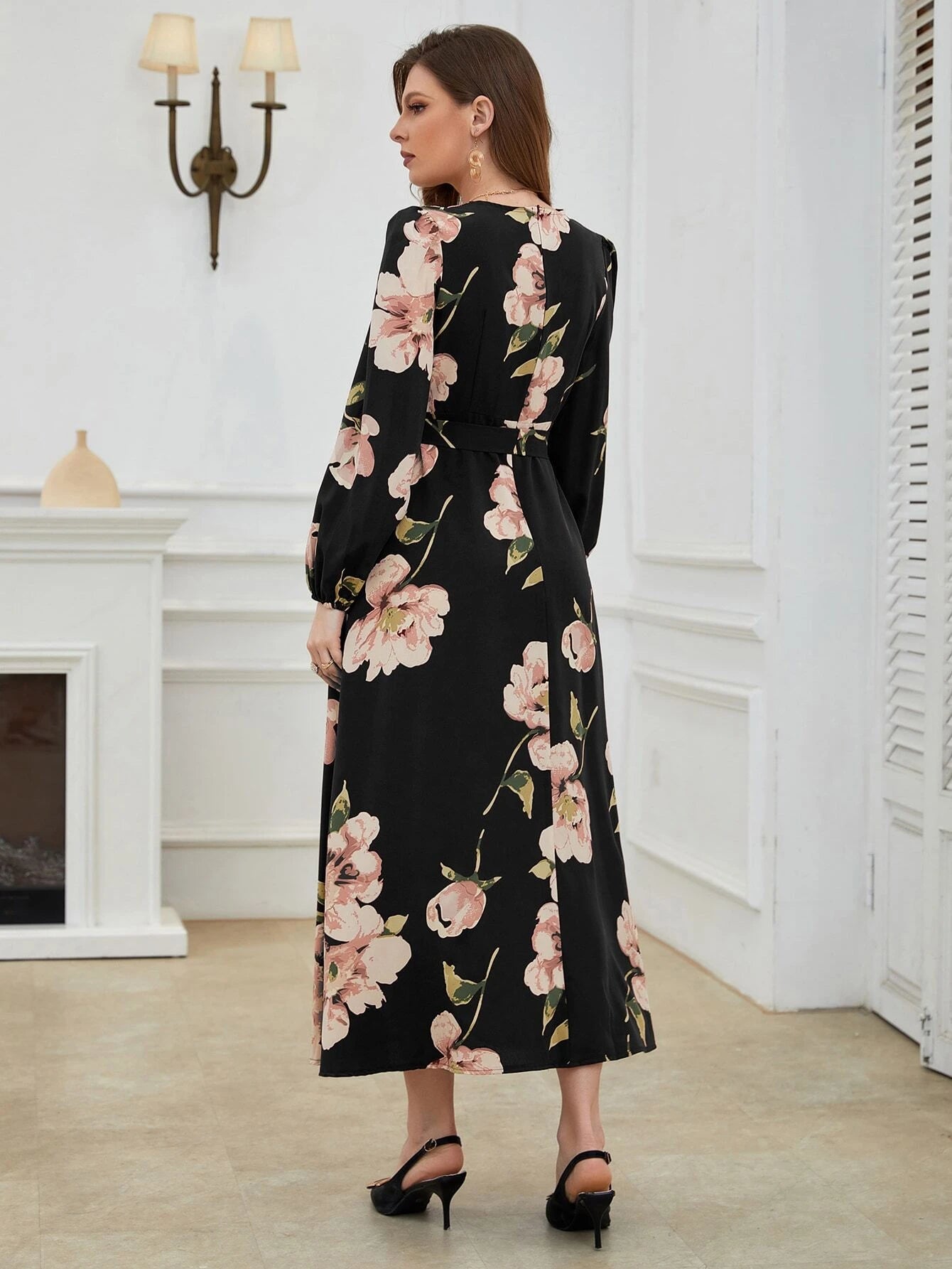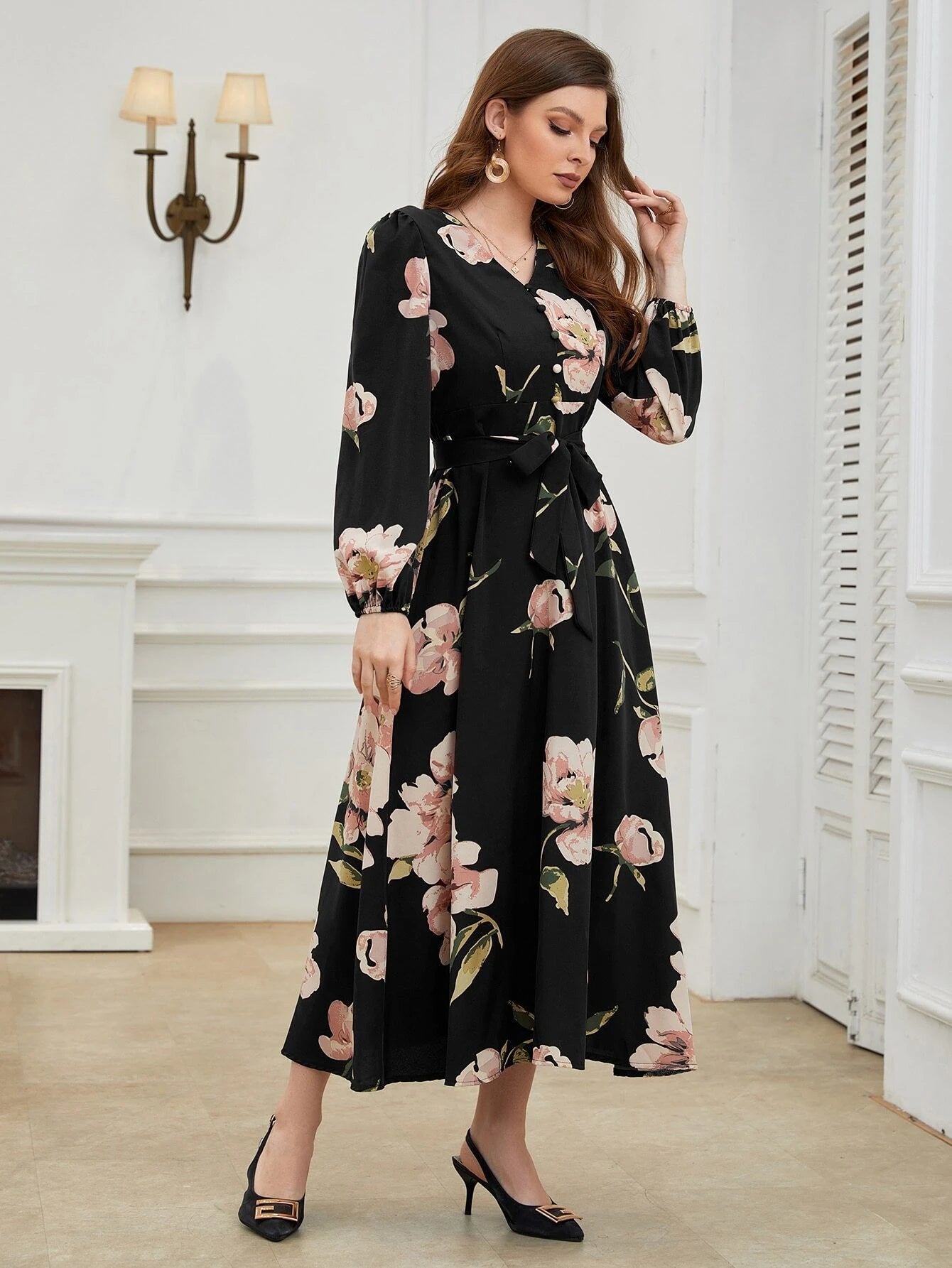 SHEIN Floral Print Lantern Sleeve Belted Dress