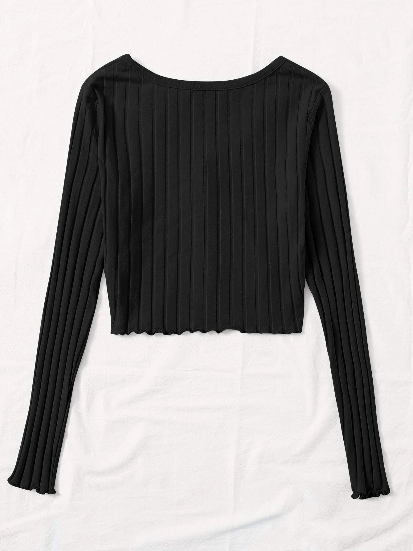 SHEIN EZwear Button Front Lettuce Trim Rib-knit Tee