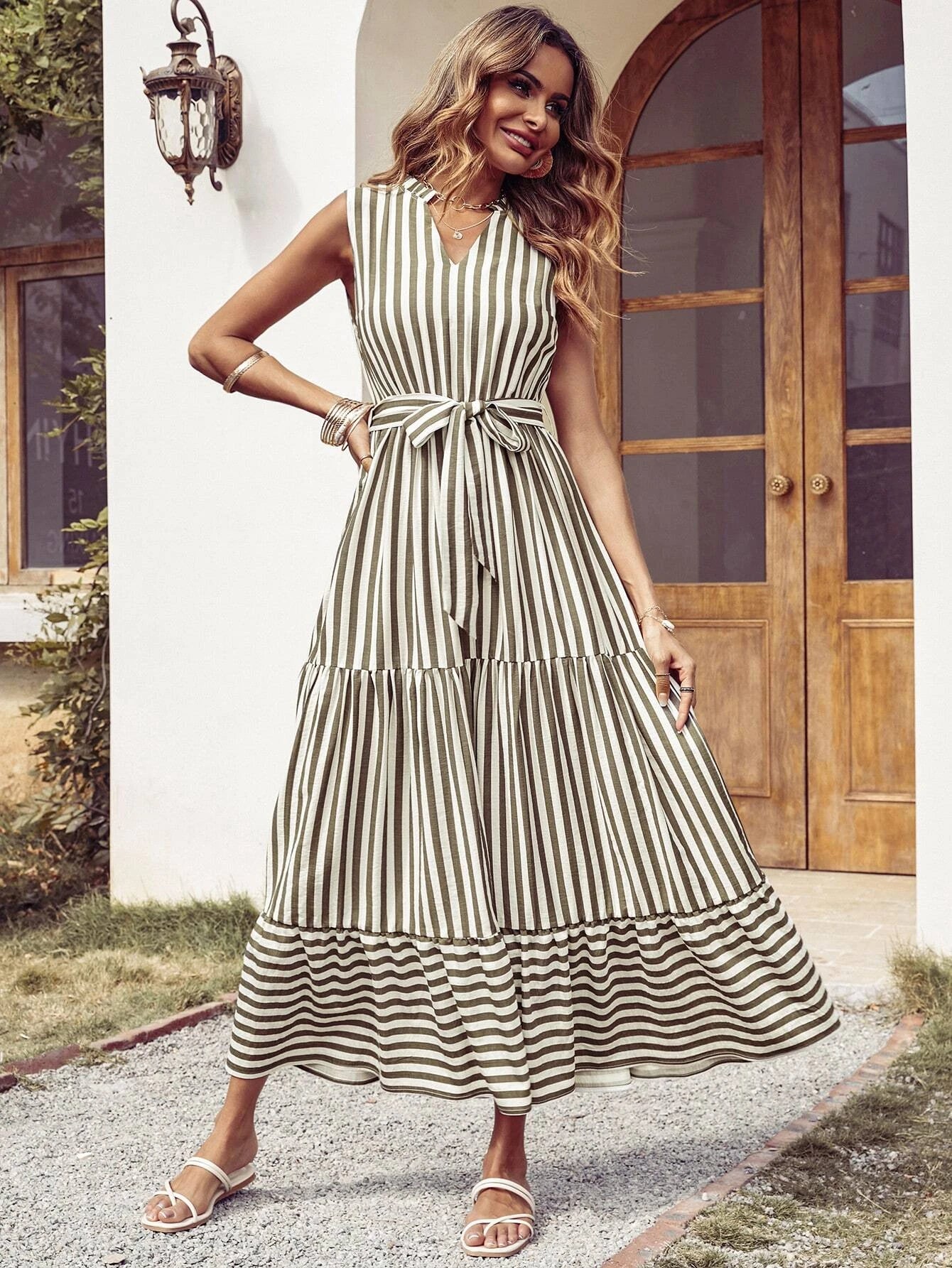 SHEIN Striped Notched Neck Ruffle Hem Dress
