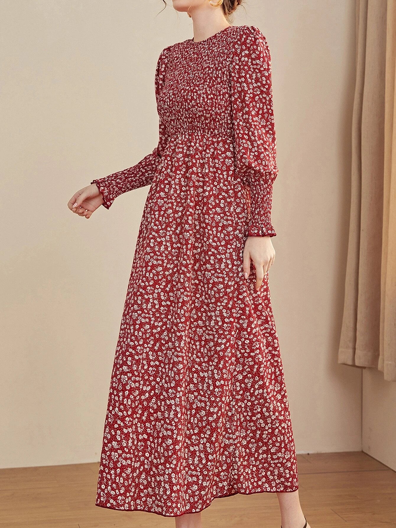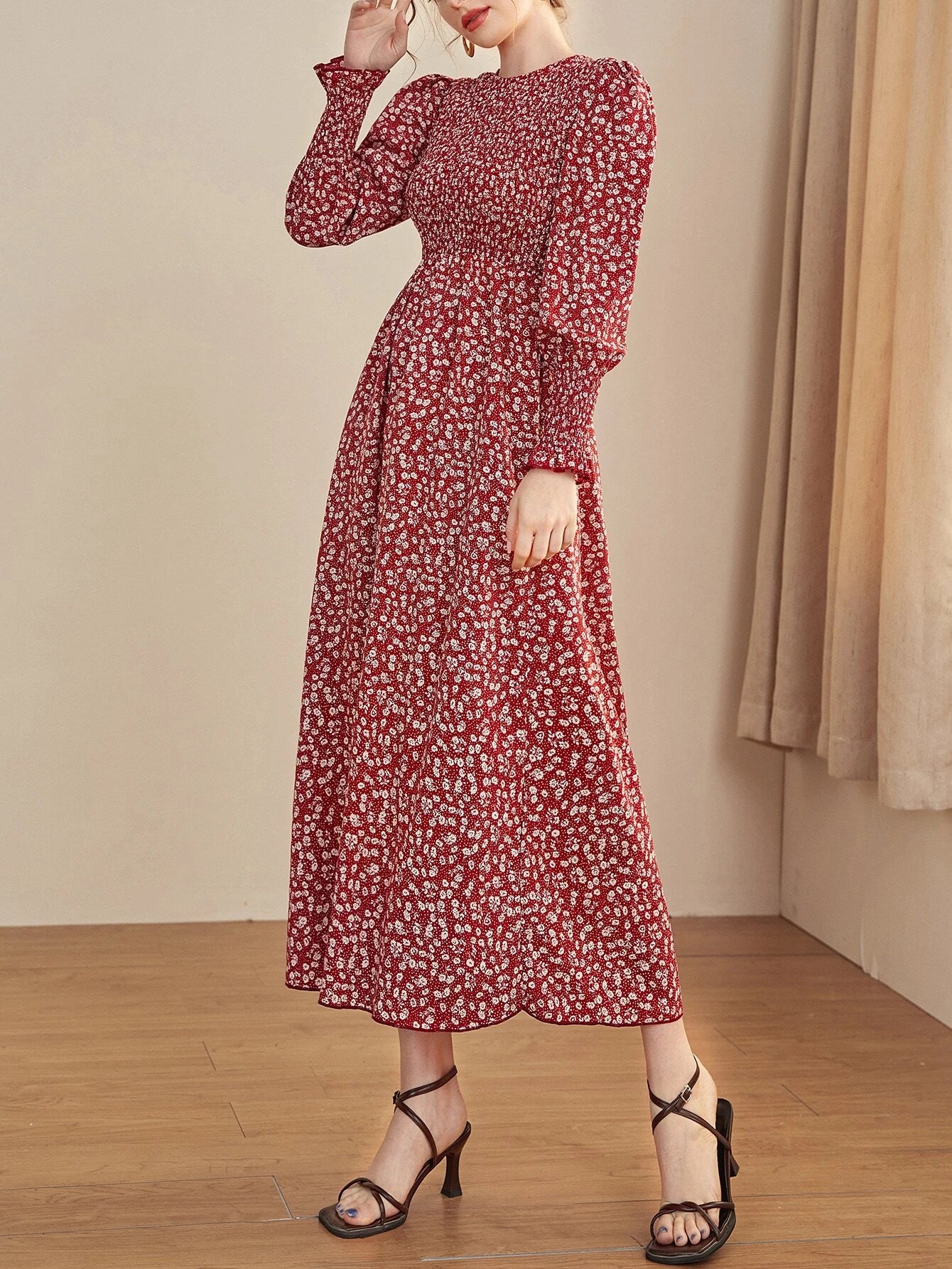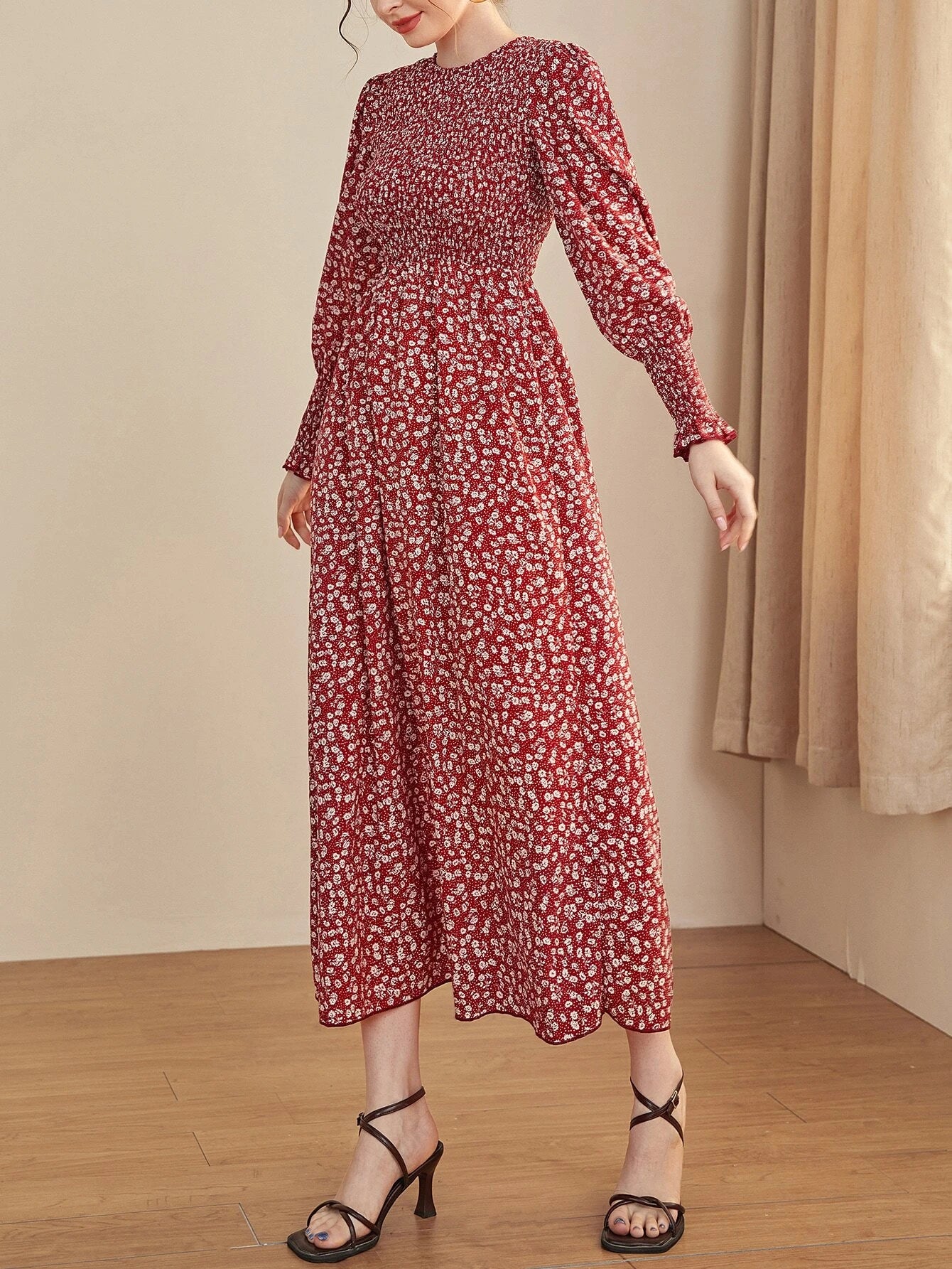 SHEIN Mulvari Ditsy Floral Puff Sleeve Shirred A-line Dress