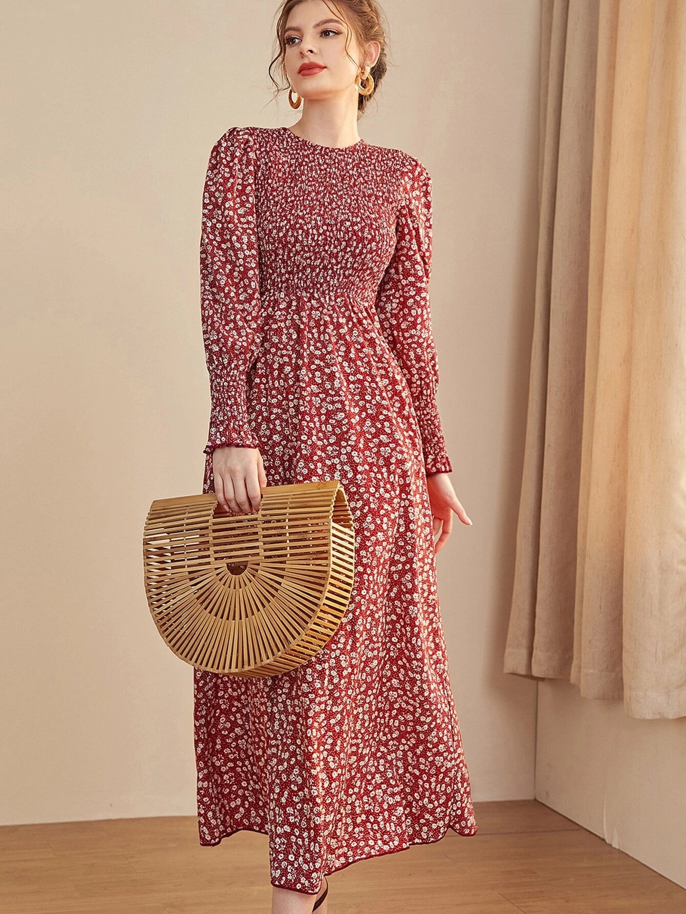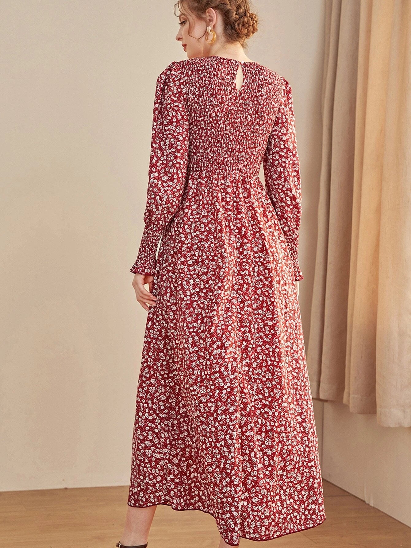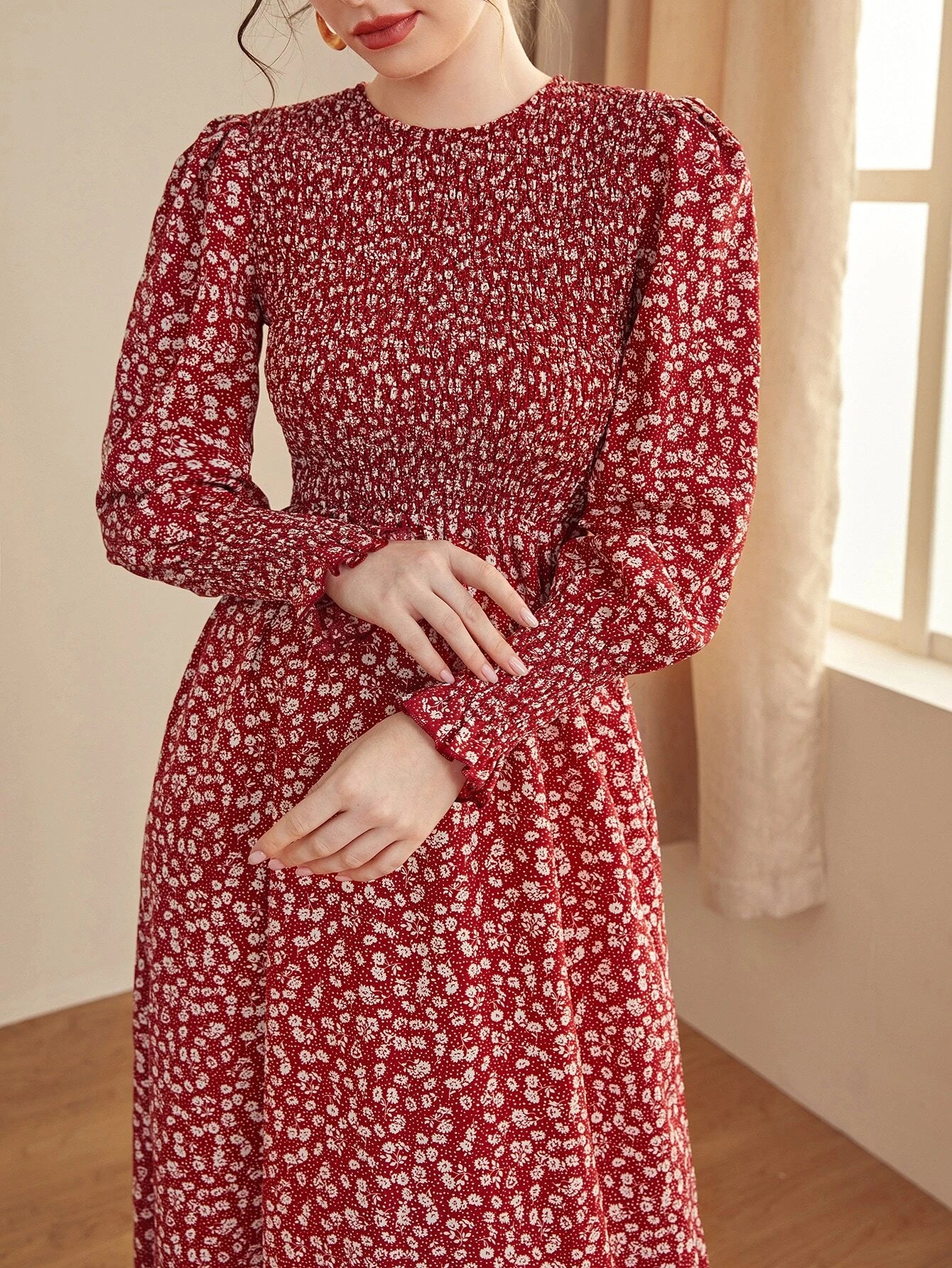 SHEIN Mulvari Ditsy Floral Puff Sleeve Shirred A-line Dress