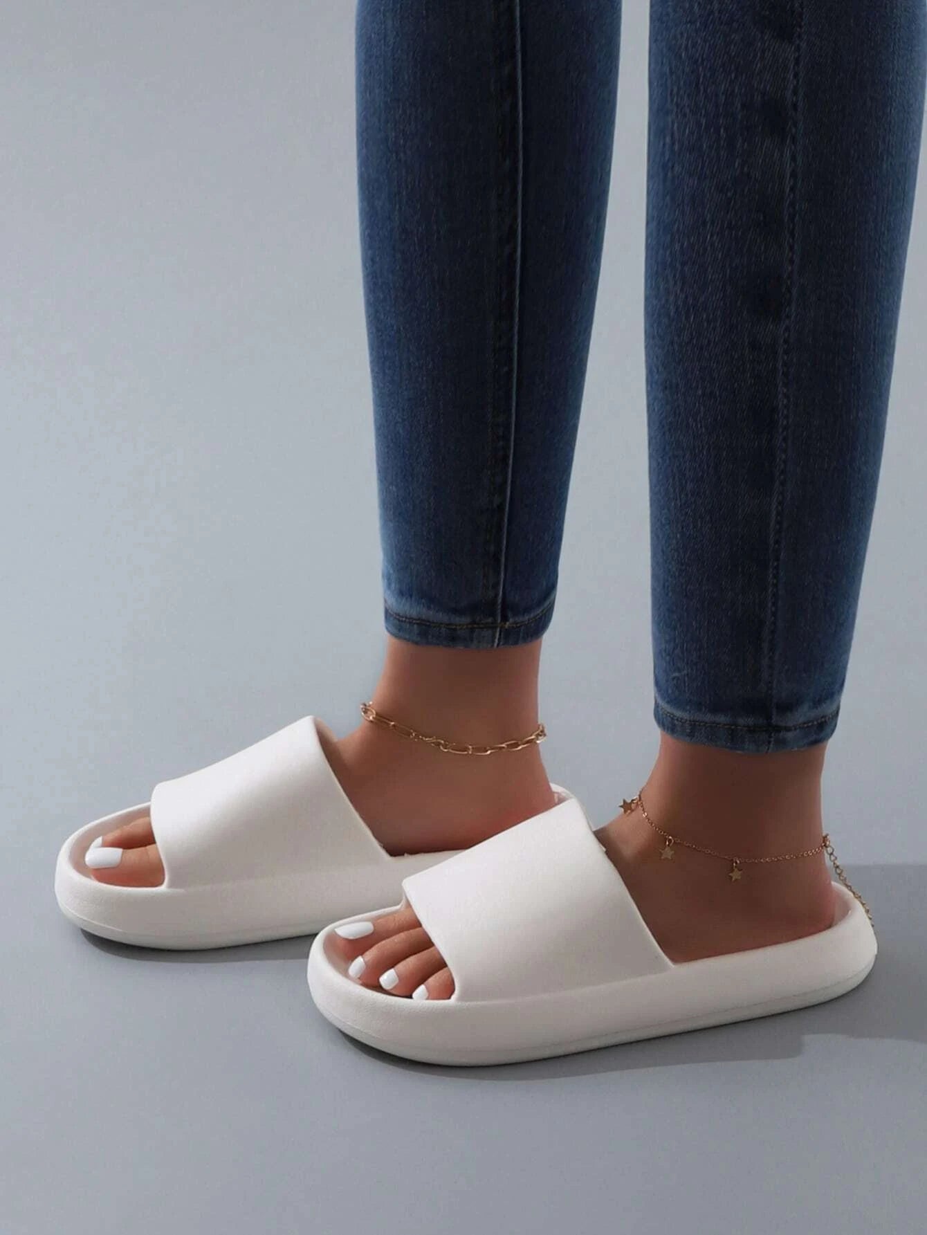 SHEIN Fashion White Slippers For Women, Minimalist Single Band Slides